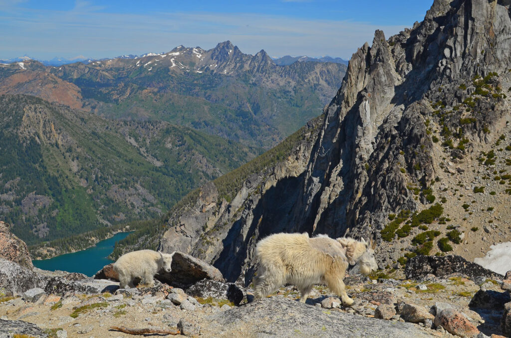Reaching the top rewards you with sweeping views back over Colchuck Lake and the surrounding peaks. A pair of mountain goats even posed perfectly for photos — a highlight of the day. Wandering among the lakes and snowfields of the Core Zone felt like stepping into another world.